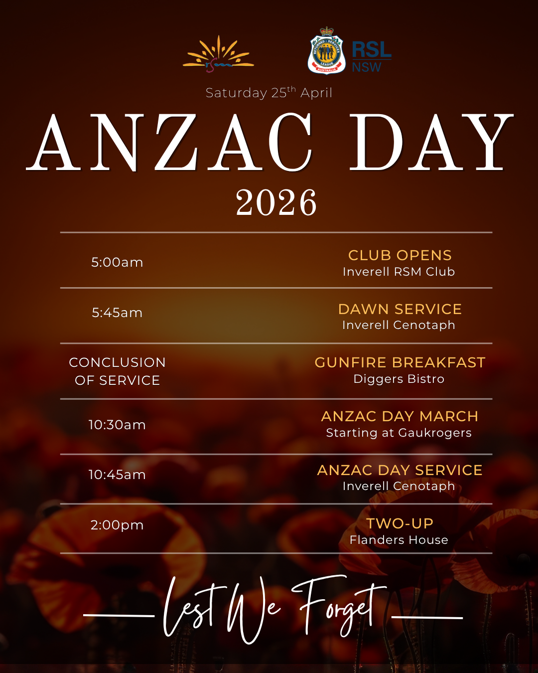 We encourage our community to come together on Saturday 25 April to reflect, pay our respects, and stand side by side in remembrance of those who gave so much. Following the Dawn Service, the club will reopen for a traditional gunfire breakfast, before closing during the main service as a mark of respect.